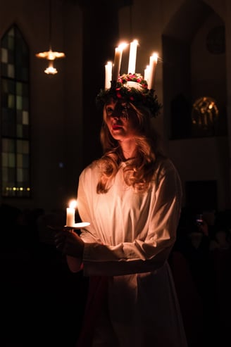 In Sweden, we celebrate 'Lucia' with the traditional 'Luciatåg' on December 13th each year. Rooted in Swedish folklore, Lucia is a symbolic figure associated with bringing light to the darkest time of the year. The Luciatåg typically involves a procession led by a young woman dressed in a white gown with a red sash and a crown of candles on her head. She is accompanied by a group of similarly attired attendants known as 'tärnor' and 'stjärngossar,' also wearing white robes. The participants hold candles and sing traditional Christmas and Lucia songs, creating a magical atmosphere. The Lucia tåg is a beautiful manifestation of light, music, and community, illuminating the otherwise pitch-black Swedish winter.
